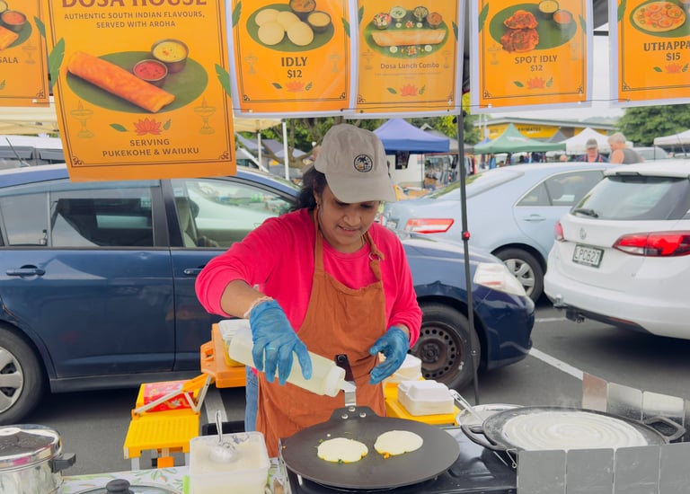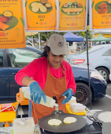 Our journey truly began at the Pukekohe and Waiuku Farmers Market. With no hot food vendors offering South Indian cuisine, we saw the perfect opportunity to share the rich, comforting flavours we grew up with. What started as small lunch boxes, prepared with care and curiosity, slowly grew into a vibrant dosa stall.